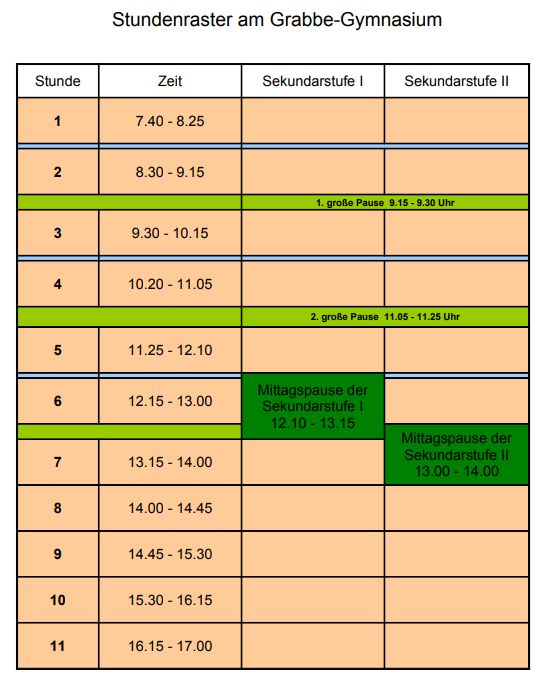 Im Laufe der Oberstufe sind insgesamt 102 Wochenstunden zu belegen, davon 34 in der Einführungsphase. Die Kernunterrichtszeit endet mit der 9. Stunde, in Ausnahmefällen liegen Kurse aber auch am späteren Nachmittag. (Hier findet ihr das Stundenraster am Grabbe mit den genauen Zeiten für alle Stunden.)